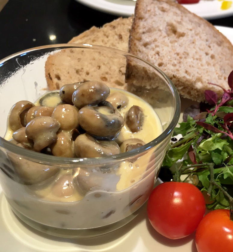in a Cream Garlic and Brandy Sauce on Toasted Sourdough served with Pea shoots
